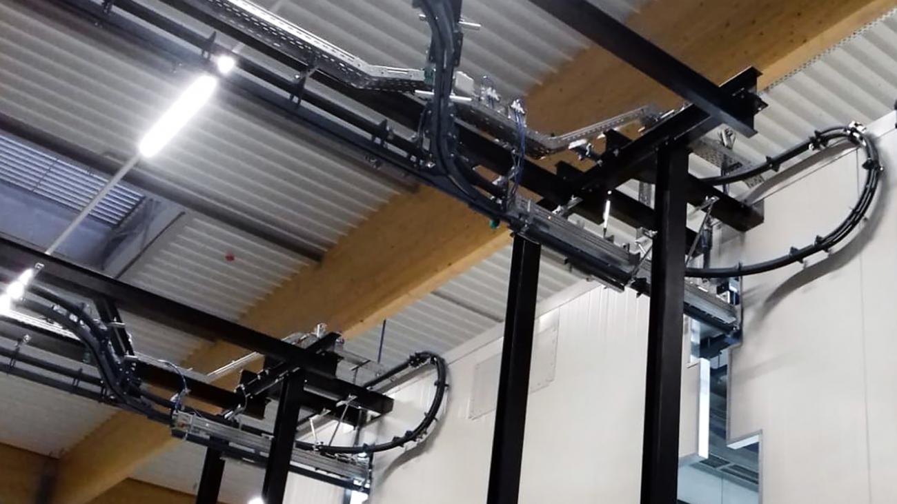 Nella "power rail" scorre una catena di trasporto rotante azionata da un motore. I cani di spinta sono avvitati nella catena del trasportatore ad intervalli regolari. Questi hanno due chiusure con le quali possono agganciarsi ai carrelli sottostanti e tirarli lungo il binario. I carrelli scorrono nella "rotaia libera" e assorbono il peso del carico del rimorchio.