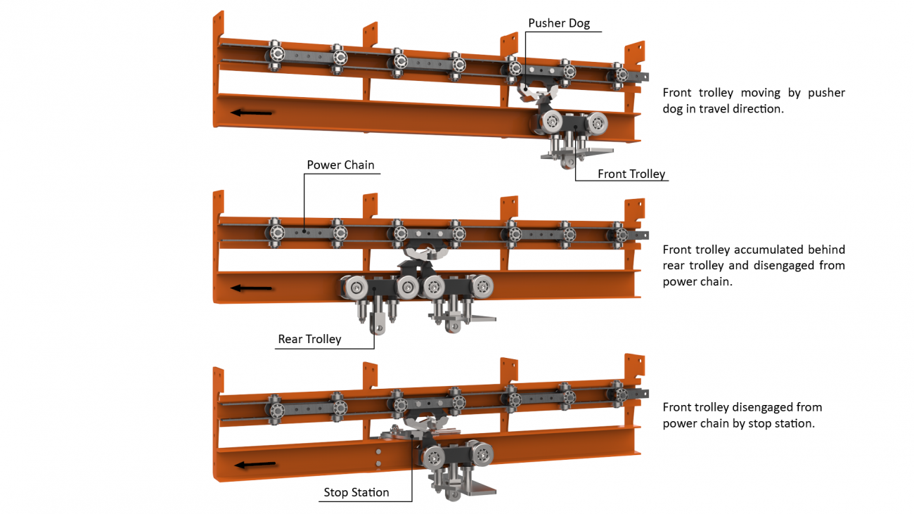 Le stazioni di arresto (disponibili in versione standard, ATEX o per utilizzo in forno ad alte temperature) sono azionate e controllate dal sistema di gestione del convogliatore. Le stazioni vengono utilizzate per sganciare i trolley dalla catena di trazione. La chiusura di una stazione causa la fermata del trolley mentre la catena di trazione continua a muoversi. Grazie alla particolare conformazione di ganci di trazione e trolley, è possibile l’arresto di più trolley in accumulo di fronte ad una stazione di arresto chiusa.