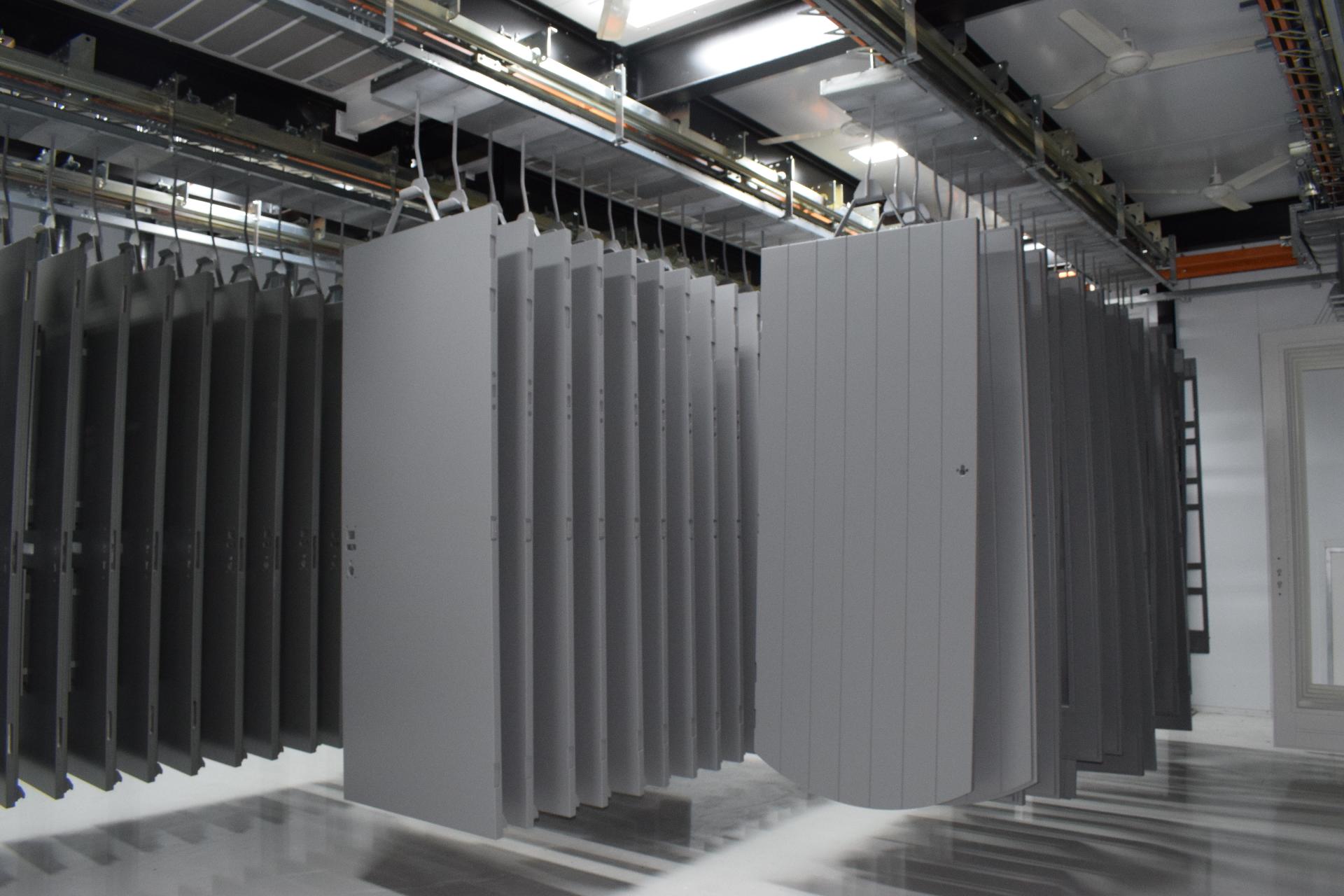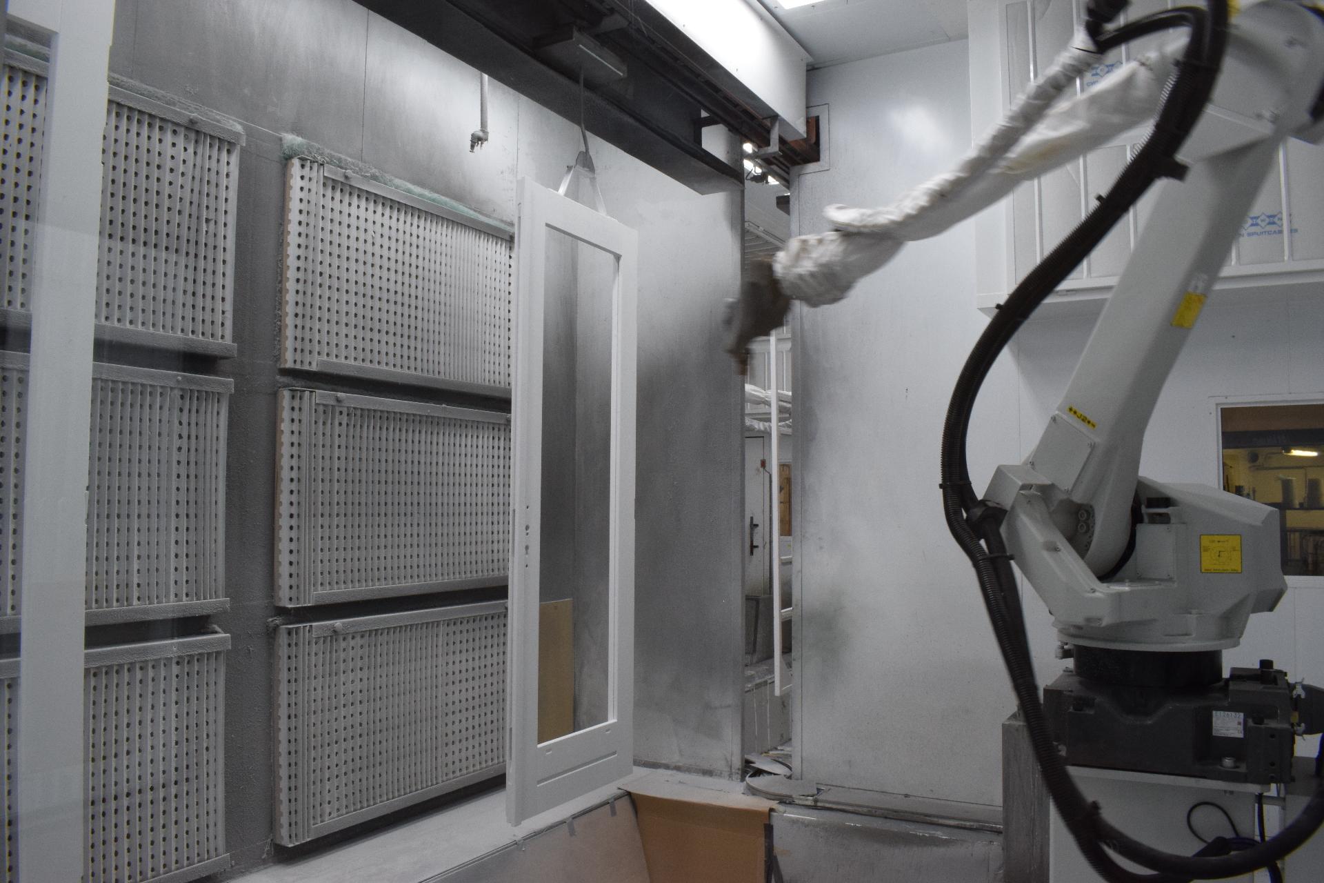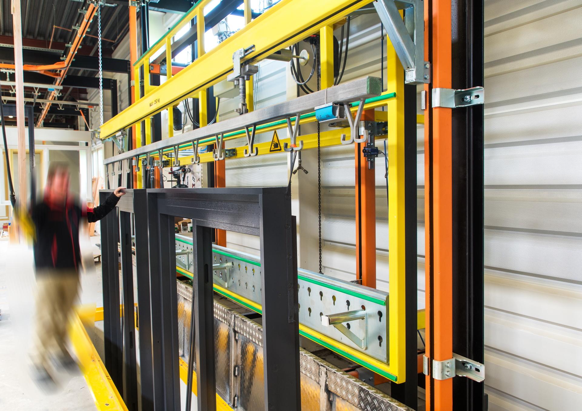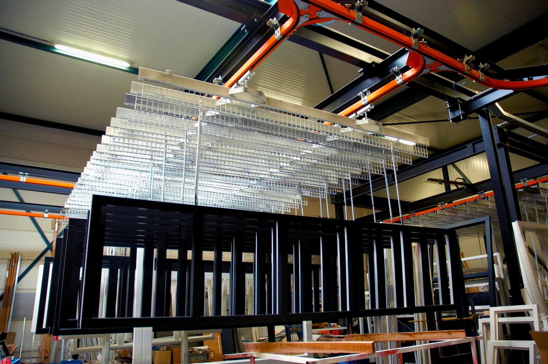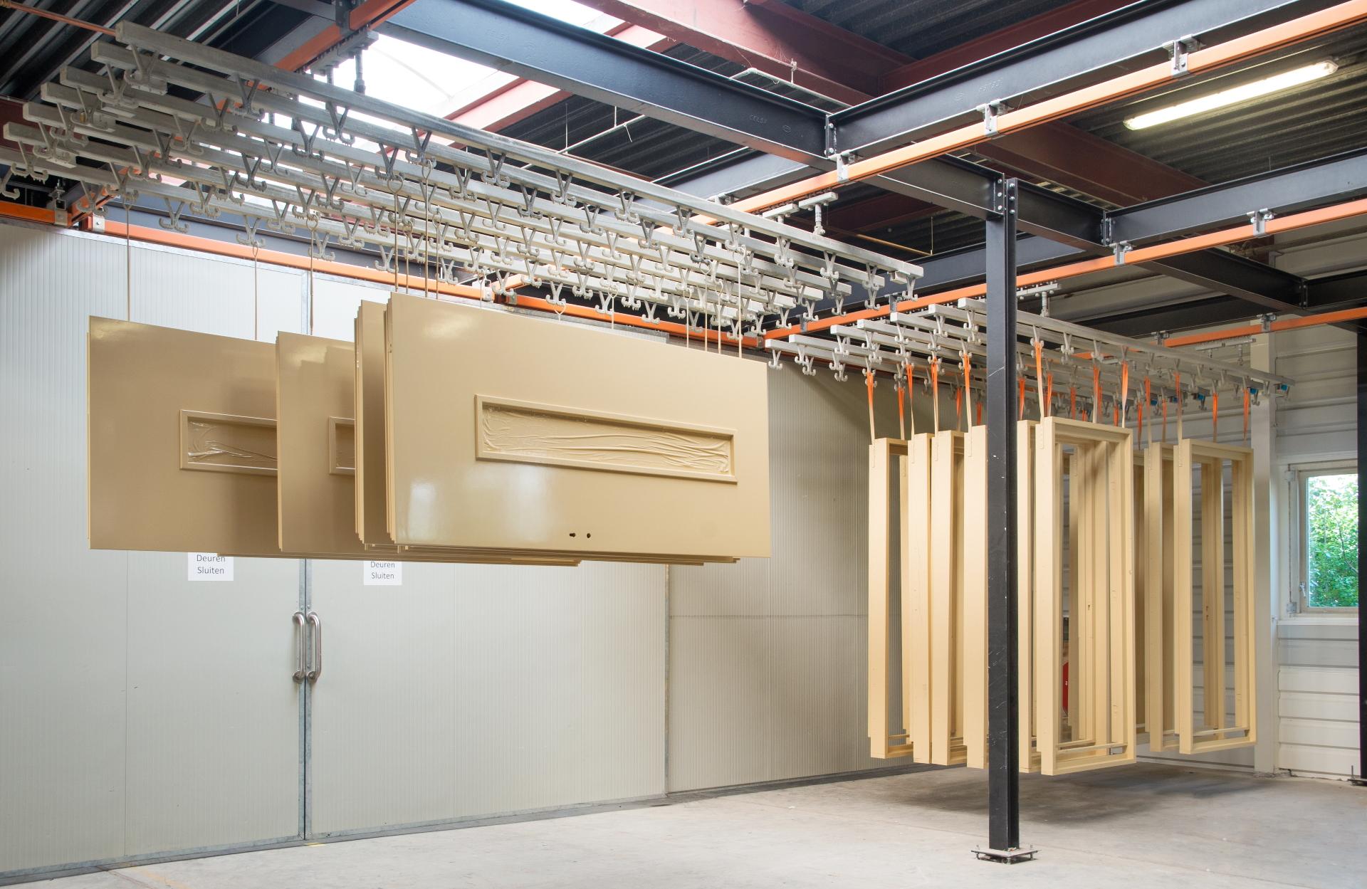 Sections of the manual monorail system can be automated by means of transfer conveyors in combination with feeding systems. Partial automation is often used when wooden parts have to be moved at a constant speed in an automated painting process, with robots or with automatic sorting of the parts based on input data.