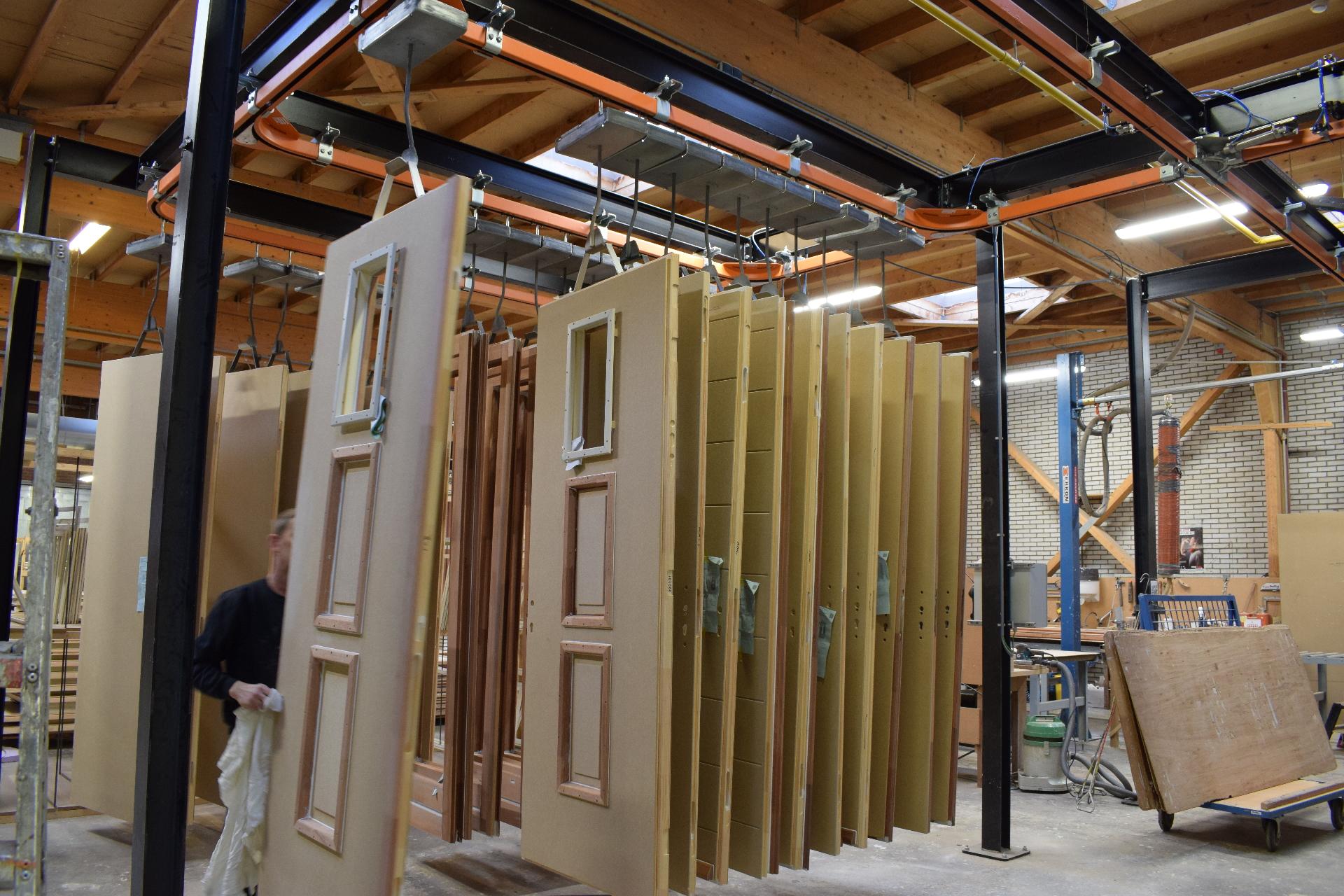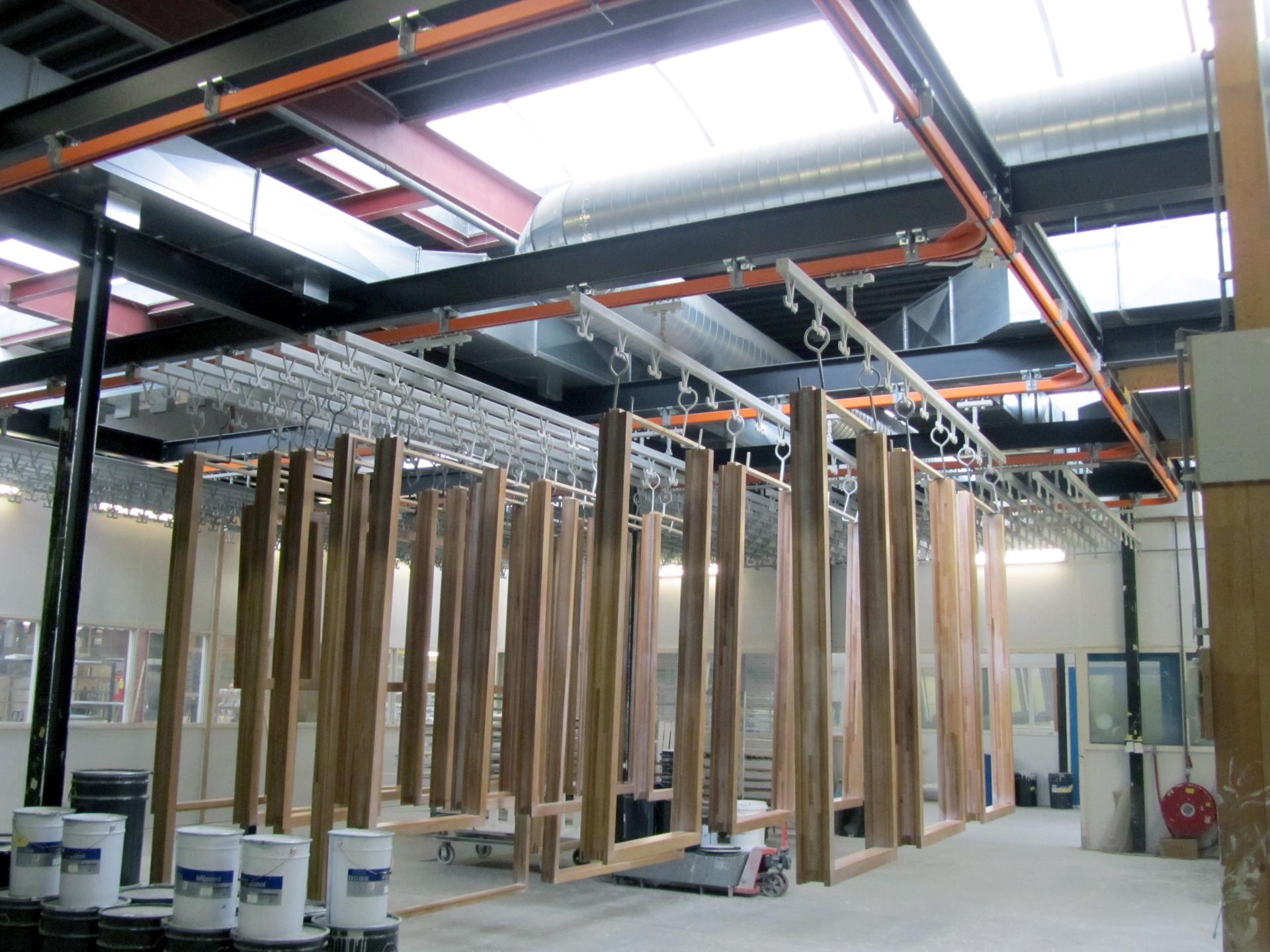 The most commonly used overhead conveyor system for moving wooden products such as window frames and doors is the manual monorail system. This system is relatively simple, has an equally long service life and requires minimal maintenance.